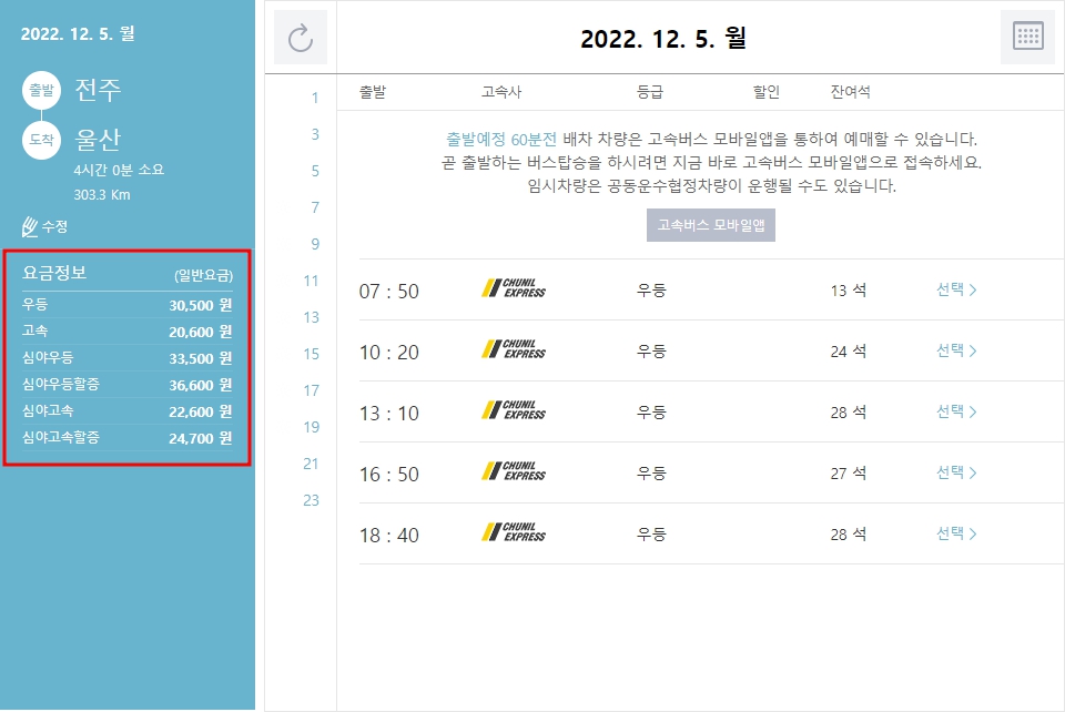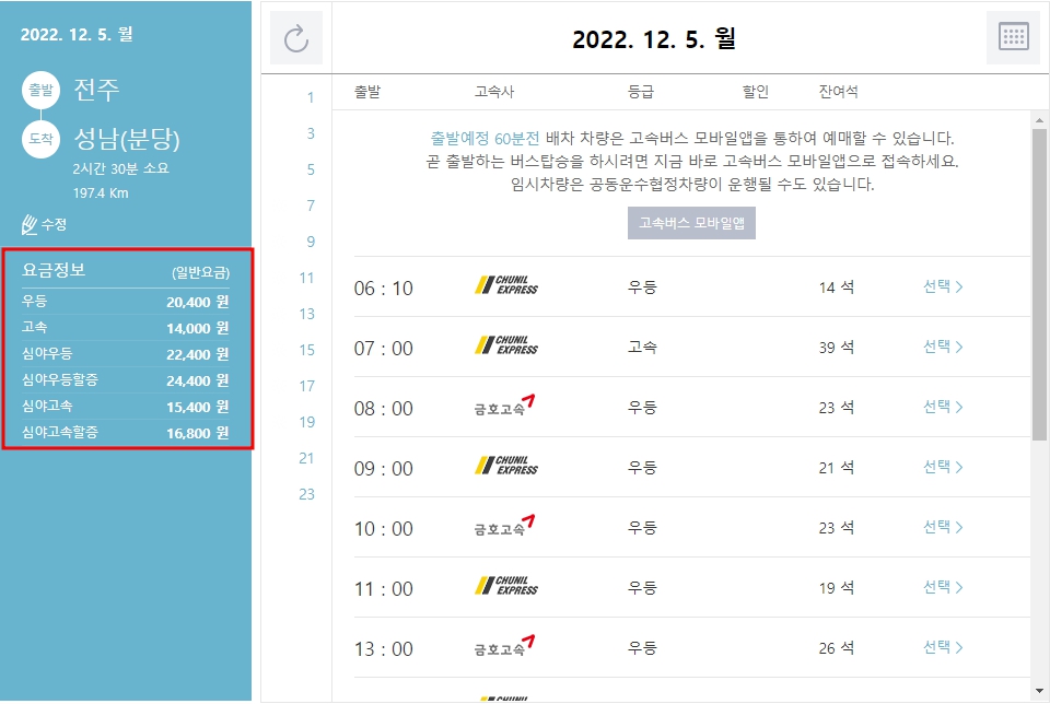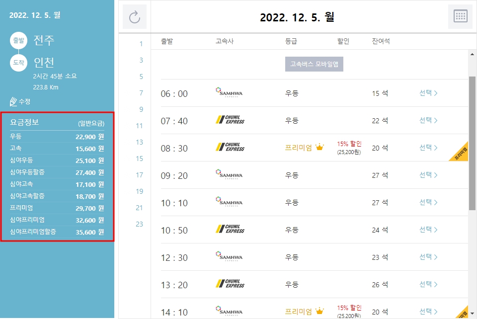 | 05 : 45 | 천일고속 | 프리미엄 |
