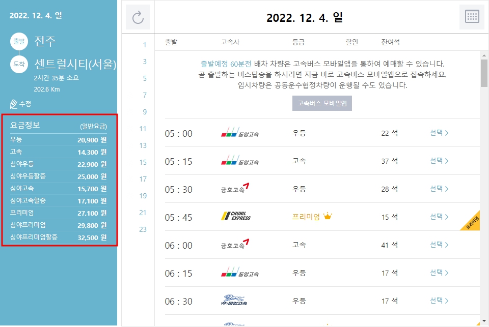 | 06 : 45 | 중앙고속 | 프리미엄 |