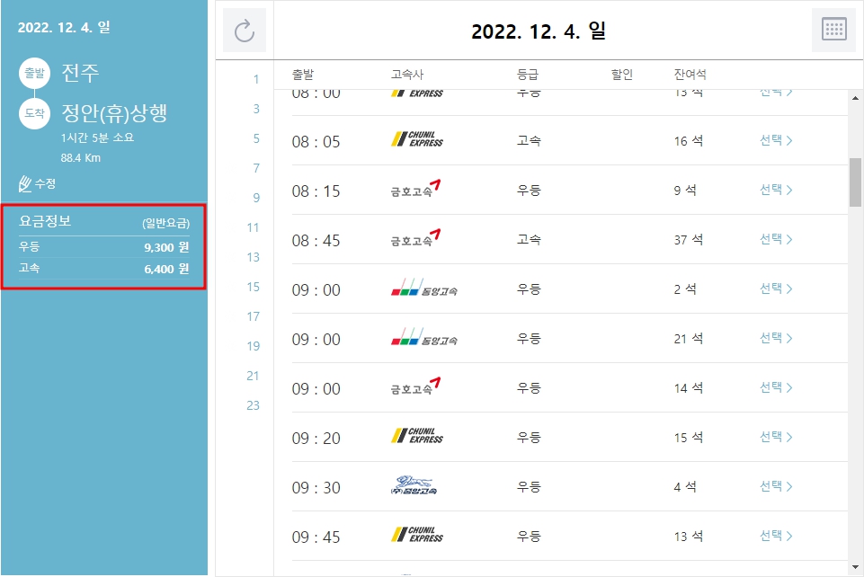 전주 고속버스 터미널 버스 요금표를
