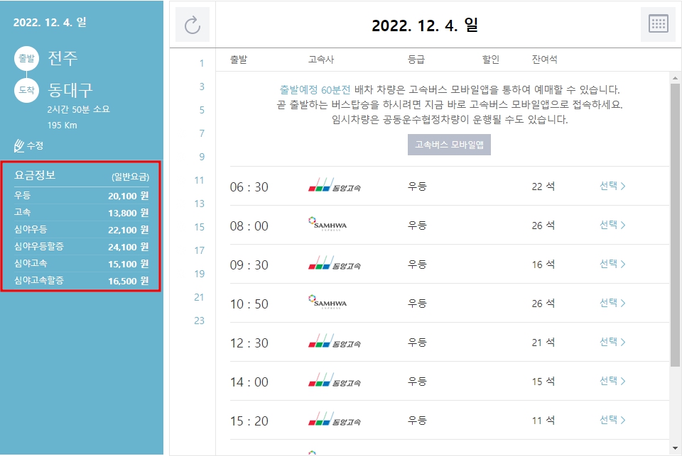 | 12 : 50 | 동양고속 | 우등 |