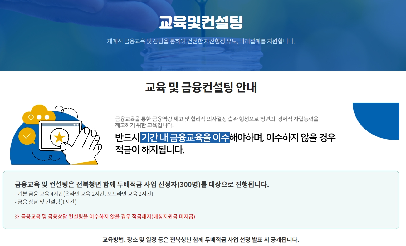 전북청년 두배적금 선정시 금융교육 및 컨설팅은 반드시 이수해야합니다. 이수하지 않을 시, 적금이 해지된다는 점 꼭 참고바랍니다.