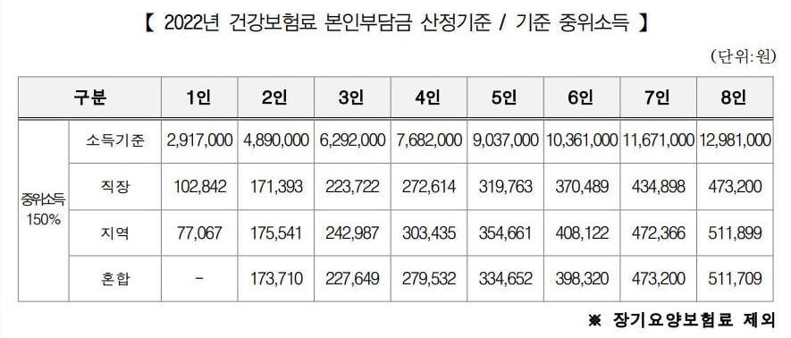 2022년 10월부터 12월까지 3개월 건강보험 고지금액이 중위소득 150% 에 해당하여야 합니다.