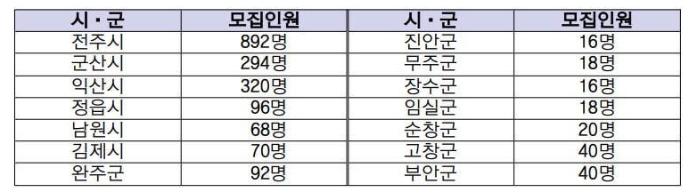 전주시가 가장 많은 892명을 선정하고 군산 294명 익산 320명 등 본인이 거주하고 있는 지역별 선정인원을 참고하시면 좋을 것 같습니다.