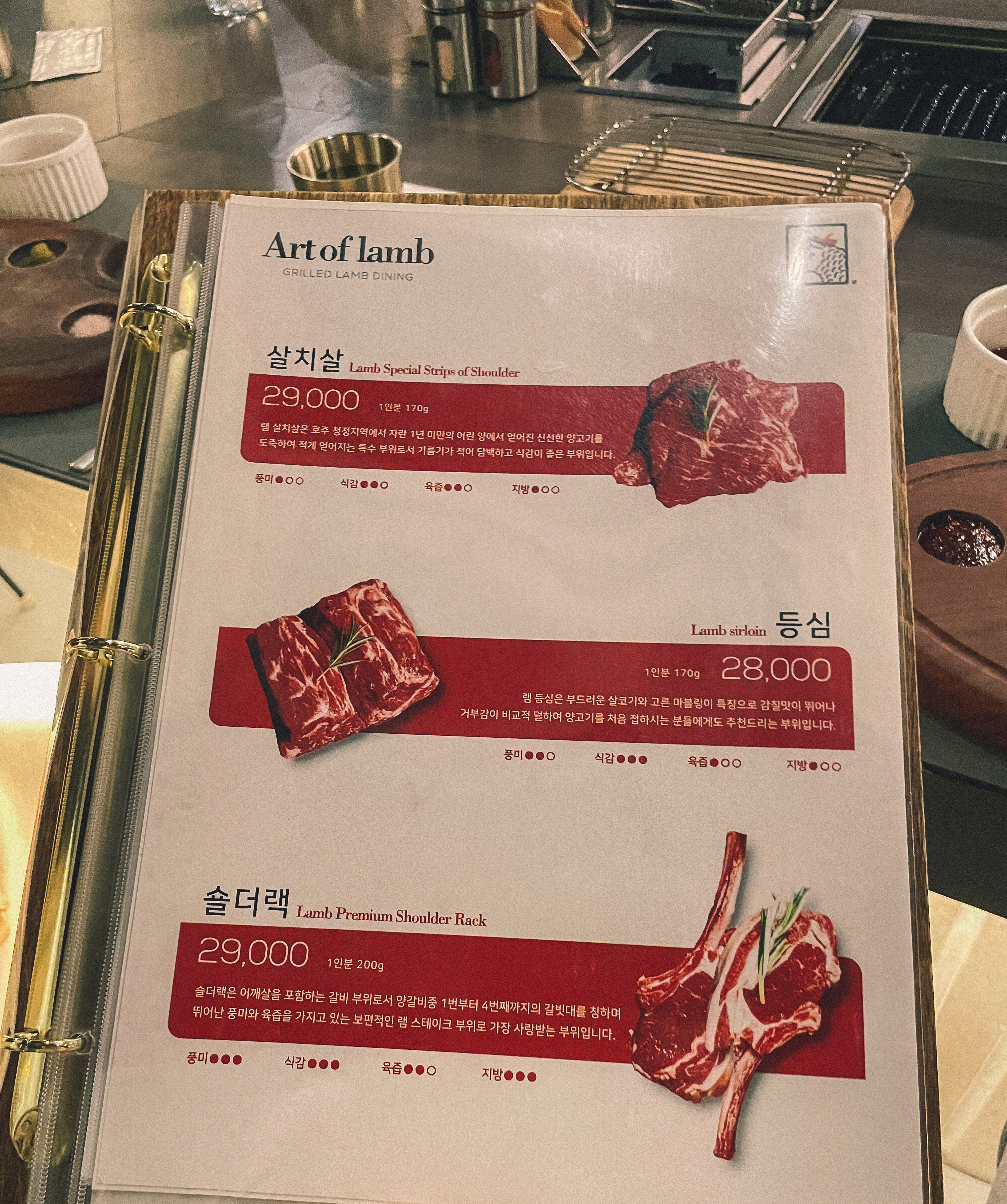 전주 양고기 맛집 아트오브램의 메뉴판입니다. 고기는 4가지의 종류 살치살(29,000원), 등심(28,000원), 숄더랙(29,000원), 프랜치랙(34,000원)으로 구성되어 있고 식사 메뉴와 와인 및 주류 등으로 구성되어 있습니다.