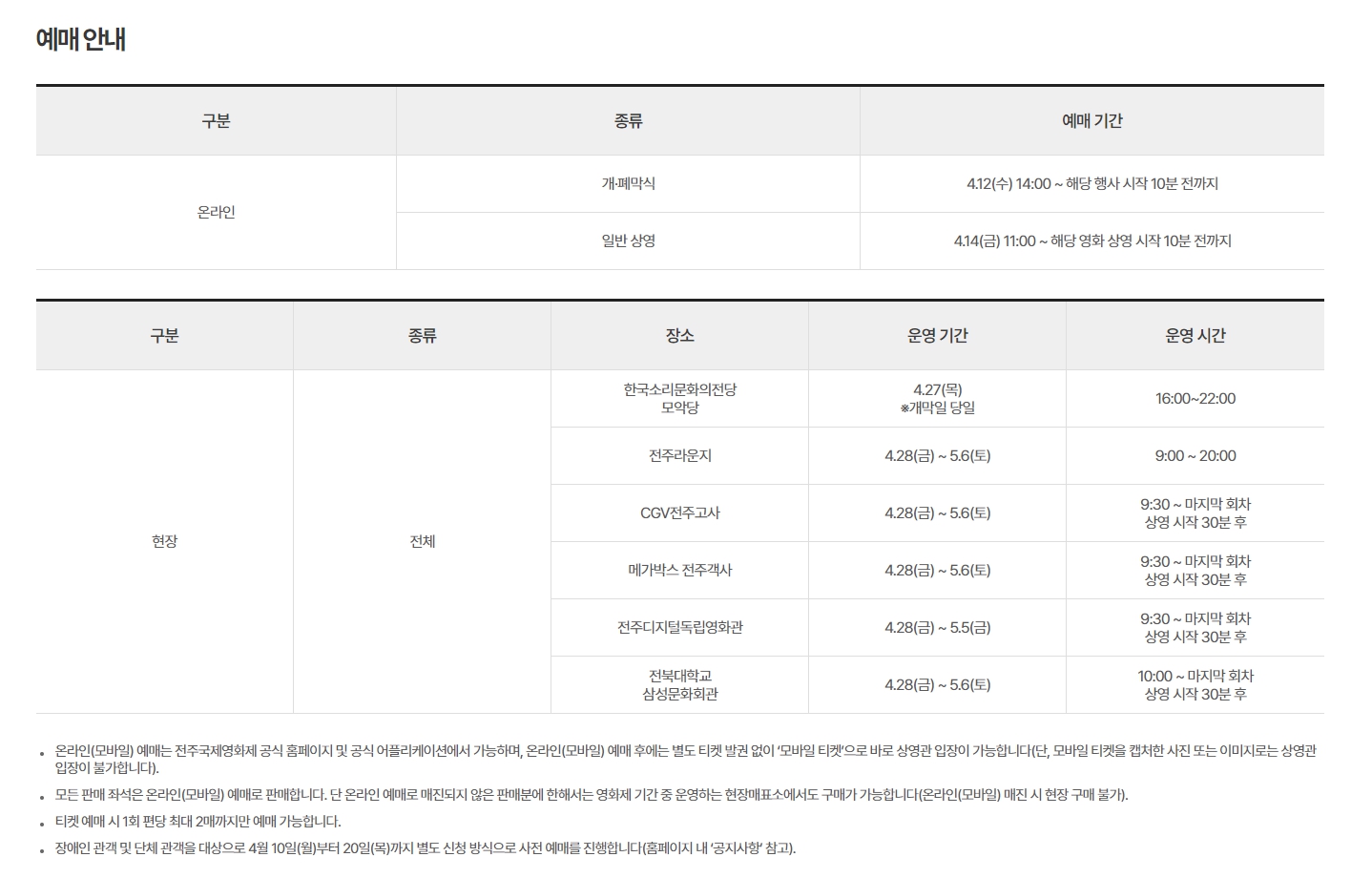 4월 11일 부터는 전주시민을 대상으로 전주 국제영화제 사전예매가 가능합니다. 전체 판매분의 20%에 해당하는 티켓을 판매한다고 합니다.
