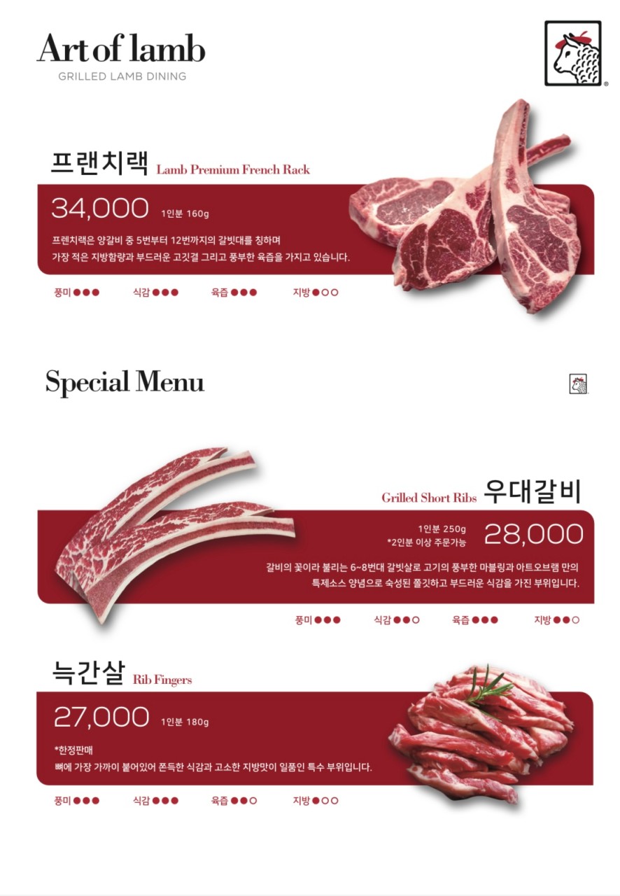 전주 신시가지 양고기 맛집 아트오브램의 주요 메뉴로는 살치살, 등심, 숄더랙 등이 있으며, 특별 메뉴로 우대갈비, 늑간살 같은 소고기도 맛보실 수 있습니다.