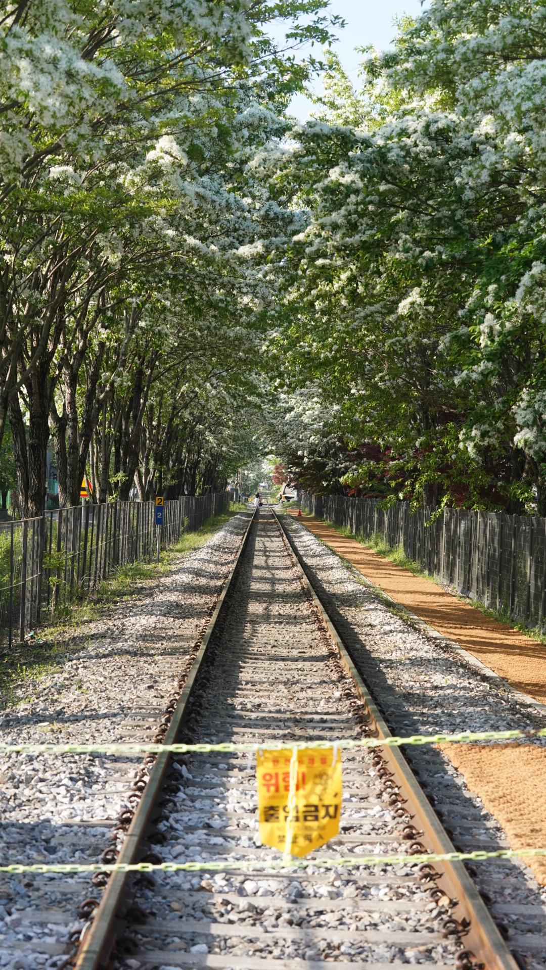비록 철길에 들어가지는 못하지만 바리게이트 밖에서 촬영은 가능한 부분이라 한적한 분위기 촬영을 원하신다면 오전 8시 내외로 방문하시면 촬영 가능합니다. 저 역시도 하단부분에 소개할 실시간 사진이 오전 8시에 촬영한 사진입니다.